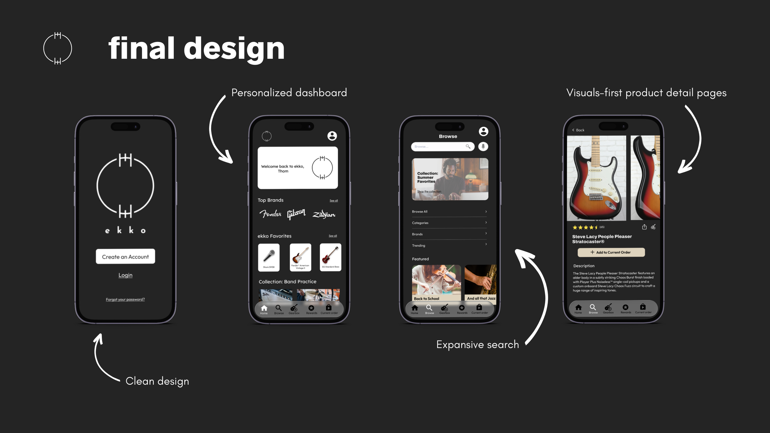 I definitely want to keep working on ekko and elaborate on screens/designs I did not have time to work on this quarter (i.e. account settings, gearbox, category pages, band instrument offerings, and an improved checkout screen).